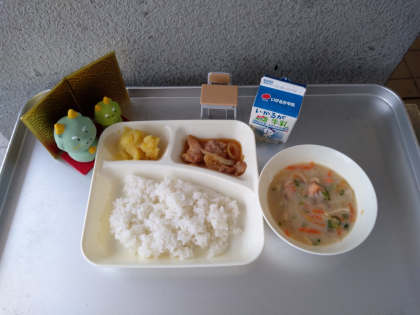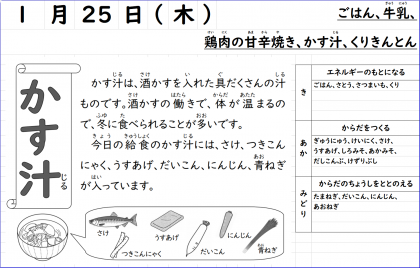 今日の献立は「鶏肉の甘辛焼き、かす汁、くりきんとん、ごはん、牛乳」でした。