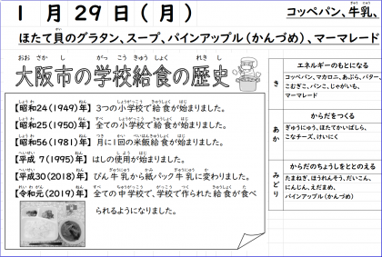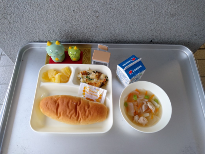 今日の献立は「ほたて貝のグラタン、スープ、パインアップル(缶)、コッペパン、マーマレード、牛乳」でした。