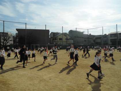 冷たい空気の中、今日もかけ足週間の取り組みをがんばりました。始めたばかりの先週から比べると、目に見えていいペースで走れている児童がたくさんいます。持久走は短距離走に比べて、自分のがんばりが記録に反映しやすく、やりがいを感じることのできる運動です。他人と比べるのではなく、自分の伸びを実感してほしいものです。