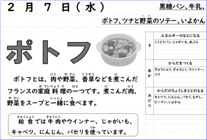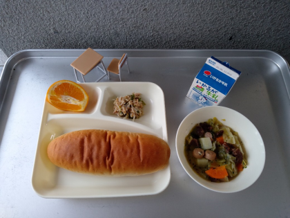 今日の献立は「ポトフ、ツナと野菜のソテー、いよかん、黒糖パン、牛乳」でした。