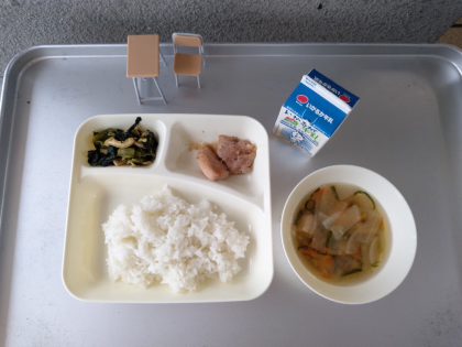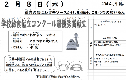 今日の献立は「鶏肉のなにわ甘辛ソースかけ、船場汁、こまつなの炊いたん、ごはん、牛乳」でした。