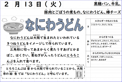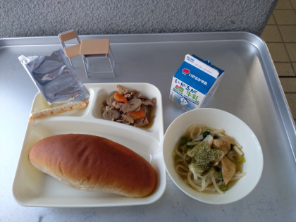 今日の献立は「豚肉とごぼうの煮もの、なにわうどん、棒チーズ、黒糖パン、牛乳」でした。