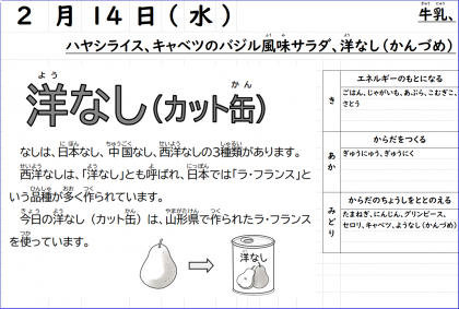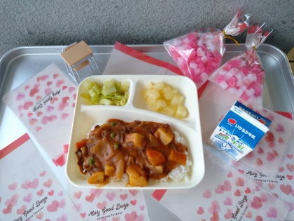 今日の献立は「ハヤシライス、キャベツのバジル風味サラダ、洋なし(缶)、牛乳」でした。