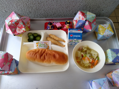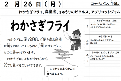 今日の献立は「わかさぎフライ、洋風煮、きゅうりのピクルス、コッペパン、アプリコットジャム、牛乳」でした。