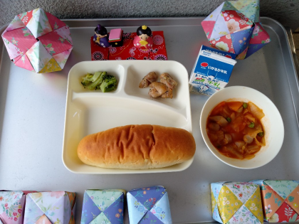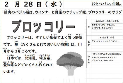 今日の献立は「鶏肉のバジル焼き、ウインナーと野菜のケチャップ煮、ブロッコリーのサラダ、おさつパン、牛乳」でした。