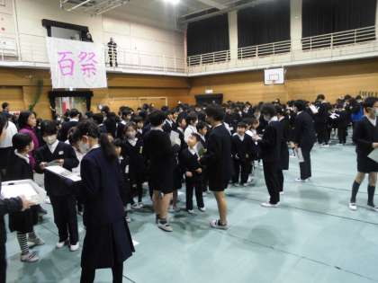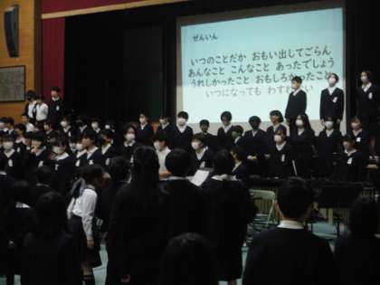 たてわり班でつくった寄せ書きを6年生に渡した後、「思い出のアルバム」の替え歌バージョンをみんなで歌いました。講堂中が温かい空気に包まれます。