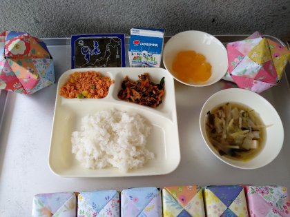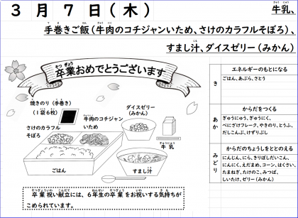 今日は、6年生の卒業を祝う献立で「手巻きご飯(牛肉のコチジャンいため、さけのカラフルそぼろ、すまし汁、ダイスゼリー(みかん)、牛乳」でした。