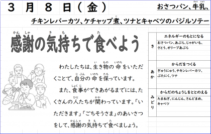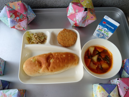 今日の献立は「チキンレバーカツ、ケチャップ煮、ツナとキャベツのバジルソテー、おさつパン、牛乳」でした。