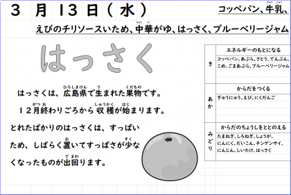 今日の献立は「えびのチリソースいため、中華がゆ、はっさく、コッペパン、ブルーベリージャム、牛乳」でした。
