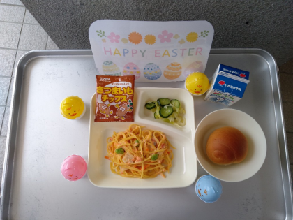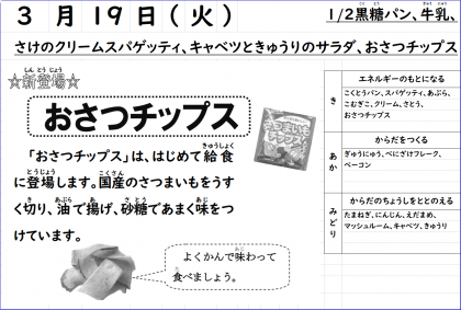 今日の献立は「さけのクリームスパゲッティ、キャベツときゅうりのサラダ、おさつチップス、1/2黒糖パン、牛乳〕でした。