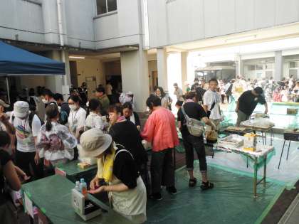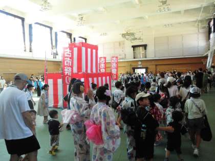 PTA主催の「古市まつり」が開催されています。「古市まつり」は、PTAを中心に古市小学校に関わる多くの方々のご協力で催す恒例の行事です。講堂内にやぐらを立てて、古市太鼓音頭などの盆踊りを行った後、ゲームや飲食などを楽しんでいます。