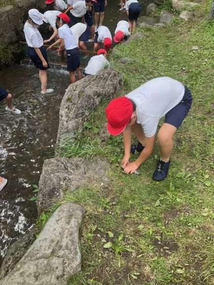 子どもたちは、魚の動きや水の冷たさに歓声(悲鳴?)をあげながら、最後までがんばって捕まえていました。水の冷たさに怯んでいた児童も、自分の手で掴みたいとがんばっていました。