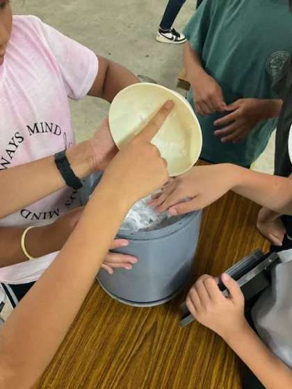 アイスクリームの元に、牛乳などを入れ、冷やすための氷と塩を容器の周りに敷き詰めたら…