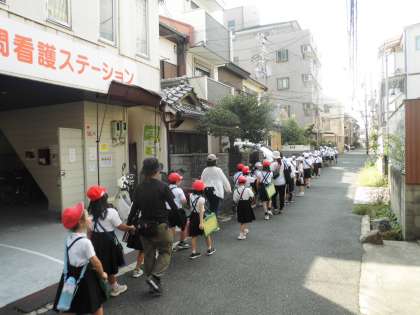 本日も、昨日に引き続いて2年生の町たんけんについて行きました。校区内の北側を中心に、商店街や公園などを見学しました。公園では木々の葉っぱの色や木の実などを見つけたり、災害倉庫やベンチなどの設備について記録していました。どの場所でも、町にいる人たちが子どもたちを温かく見守ってくださったのがありがたかったです。