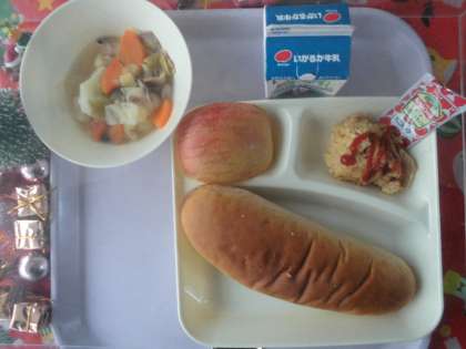 いよいよ本格的に寒くなってきましたが、給食当番は気を付けながらがんばっています。今日の献立は、パン・牛乳・とうふローフにケチャップ・カリフラワーのスープ煮・りんごでした。耳慣れない「とうふローフ」については、給食委員が放送で説明してくれました。ツナにとうふや大豆などを混ぜ込み、焼き上げたものです。卵は使っていませんが、滑らかな口当たりのツナを堪能できる一品です。ぜひ感想を聞いてみてください。