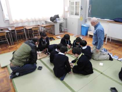 1年生の昔遊びの学習に、地域の方々が応援に来てくれました。今では、なかなか目にすることの少ない遊びですが、昔から続く遊びです。児童はすぐに夢中になって取り組み、地域の方々がていねいに説明しながら、時には手を取り、楽しませてくれています。こういった人と人との触れ合いが、児童にとっても本当に大切な経験となることでしょう。