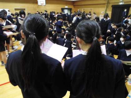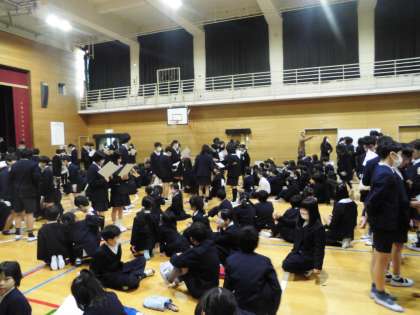 たて割り班でメッセージを書いた色紙を、それぞれの班でお世話になった6年生に渡しました。全校オリエンテーリングやゆうゆうタイムでの運動遊びなど、充実した異学年交流ができたおかげで、本当に気持ちのこもったプレゼントができました。