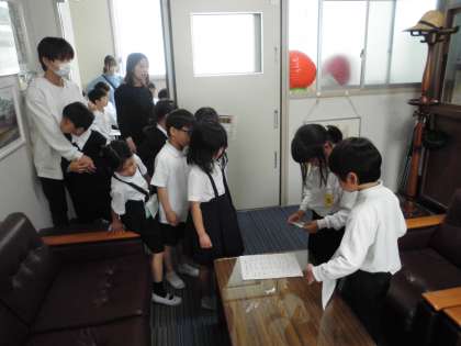 今日の3時間目に、2年生が1年生を連れて学校探検に取り組んでいました。それぞれの場所で紹介する係や1年生を引率する係に分かれて、しっかりとがんばっていました。丁寧に説明したり、1年生の手を引いたりする姿は、先輩としての自覚を感じさせるもので、とても頼もしい態度でした。