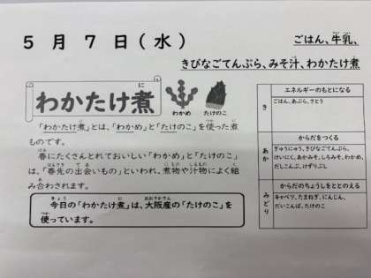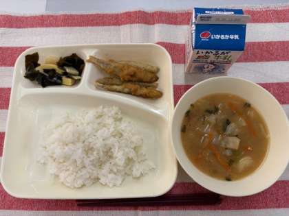 ・ごはん、・牛乳、・きびなごてんぷら、・みそ汁、・わかたけ煮でした。