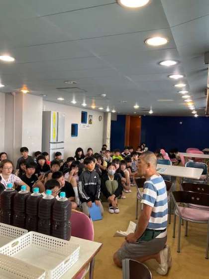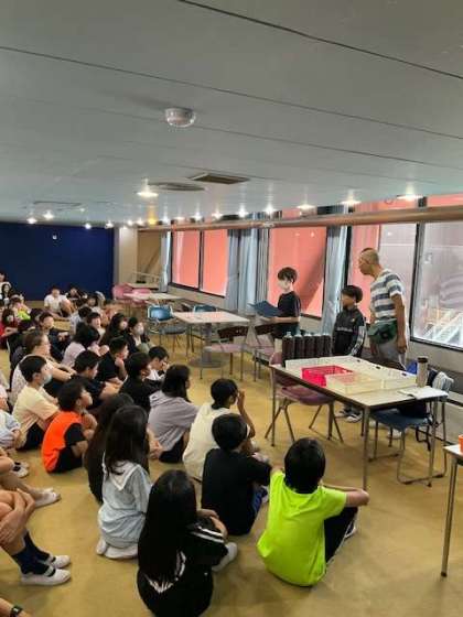 明け方、あいにくの雨のため、室内で朝の集いを行いました。