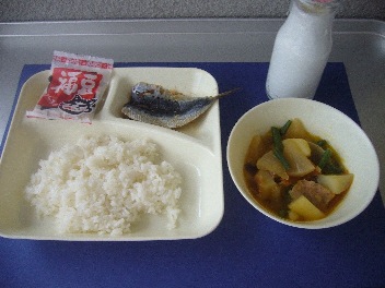 給食では、「いわしのしょうがじょうゆかけ」と「いり大豆」が