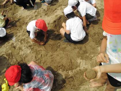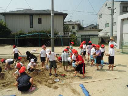 今日は1年生が砂場で水を使って、生活科の学習に取り組んでいました。溝を作って水を流したり、泥団子を作ったりと、思い思いに活動を楽しんでいました。普段はなかなか体感することのない感触に、児童は大喜びでした。