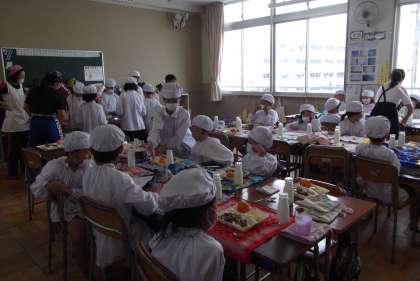 夏野菜カレーライス、キャベツのサラダ、冷凍みかん、牛乳