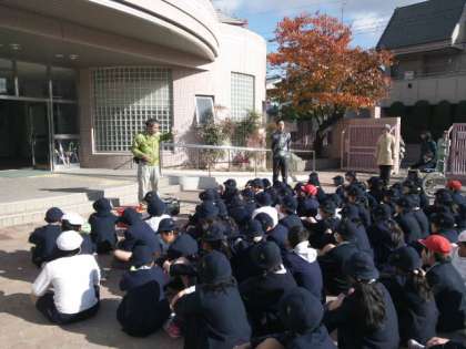 午前9時45分運動場 正門前広場でシャワーハウスの安藤英康さんのお話を聞きました。このようなお話がありました。