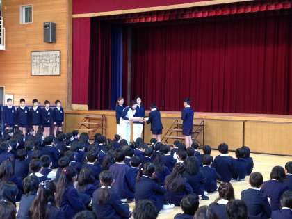 1月23日の朝の集会は、給食集会です。給食委員会が全児童にむけて、給食に関するクイズを出し、給食の歴史、ねらいなどをみんなで学びました。