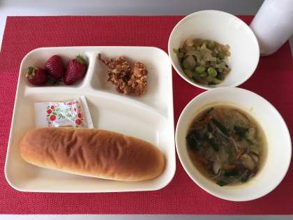 献立は、牛乳・コッペパン・りんごジャム・ピリからあげ