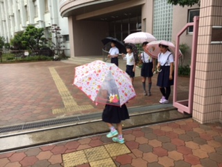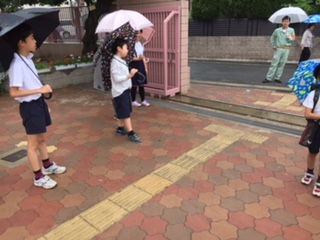 かさをさしながら、登校してくる子どもたちに