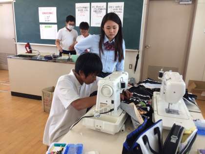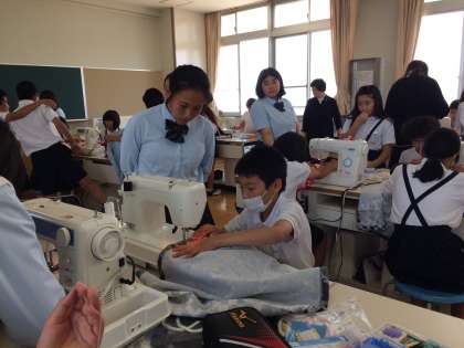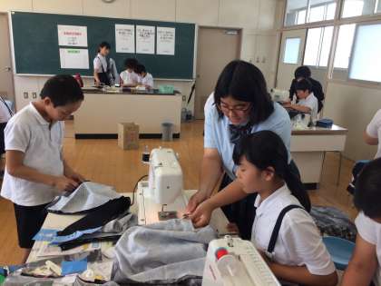 毎年 東洋学園の生徒さんたちが 家庭科の学習支援に来てくださっています。6年生はエプロン作りです。ミシンを使って仕上げます。ていねいにわかりやすく教えてくれました。