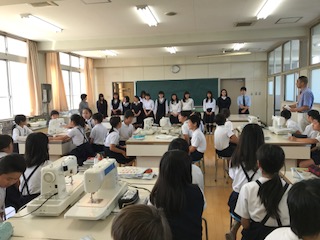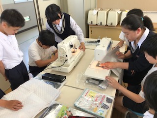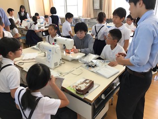 東洋学園の生徒さんたちに ナップザック作りの支援をしていただきました。5年生は ミシンを使うのはが初めてです。みんな一生懸命に聞きながら がんばってナップザック作りに臨んでいました。