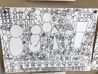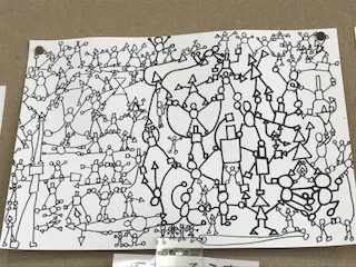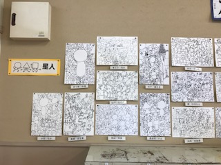 日曜参観で描いていた絵が完成しました。いろいろな星人がいます。