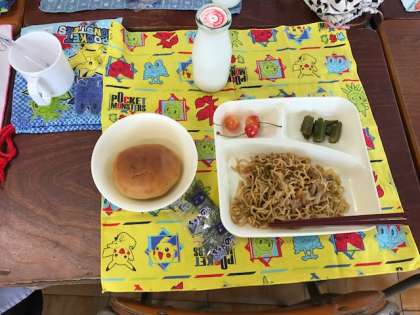 焼きそば オクラの中華あえ さくらんぼ 牛乳 黒糖パン 焼きのり