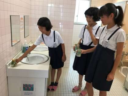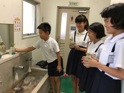 環境委員会では 毎週月曜日にトイレの手洗い場に 自分達がペッボトルで作った容器に 学校の野草を飾って 環境美化に努めています。