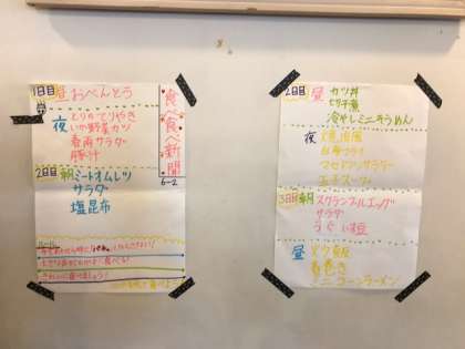 入浴タイムが終わり いよいよ夕食タイムが近づいてきました。食事係が 食べ食べ新聞を作っています。