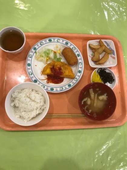 ミートオムレツ カニクリームコロッケ ナチュラルカットポテト サラダ(ボイルキャベツ コーン きゅうり 人参)塩昆布 漬物 みそ汁 ごはん