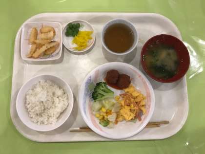 スクランブルエッグ サラダ うぐいす豆 ごはん
