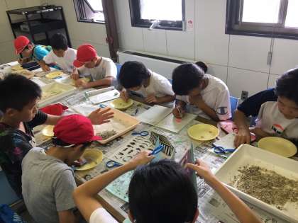 カッター訓練と並行して ちりもん体験活動をしました。ちりめんじゃこの中にまぎれている小さなモンスター (エビ カニ タツノオトシゴ 小魚など)を見つけて その名前を調べます。