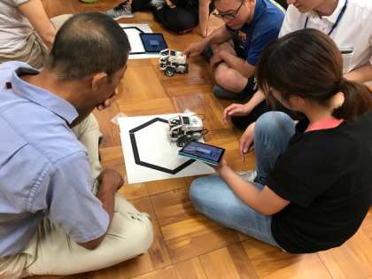 各グループでプログラミングをして試しています。無事目標達成したところが たくさんでてきました。