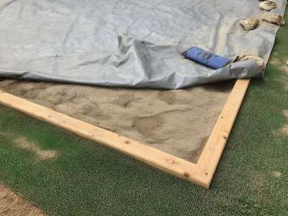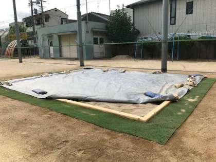 砂場の土を付け足して入れるとともに 周囲の木枠を新しく取り替えて付けました。