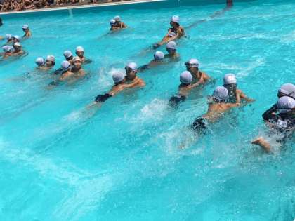 水慣れの後、6年生は1年生が取り組んできた「ペンギン体操」を行いました。