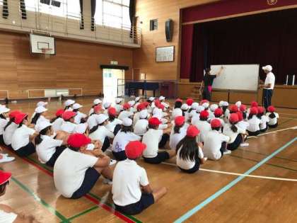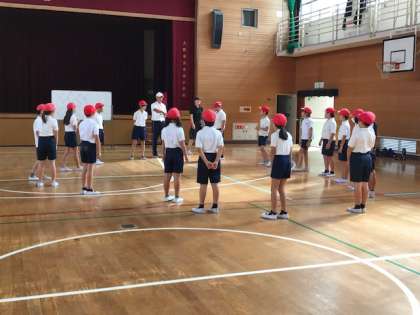 団体演技の隊形変化を講堂で練習しました。
