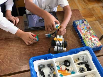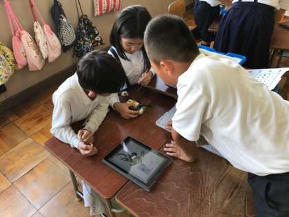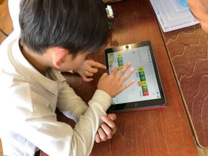子どもたちは いろいろ考えを出し合いながら センサーで動くように プログラムをしていました。