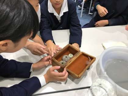 まず ある生き物の殻を見て におって さわって それが何かを考えました。