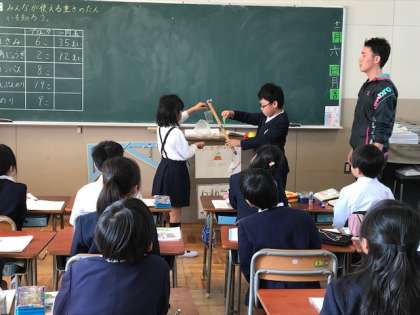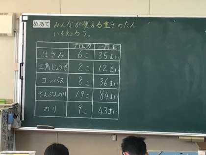 はさみ 三角じょうぎ コンパス でんぷんのり のり の5つのものの重さを調べました。