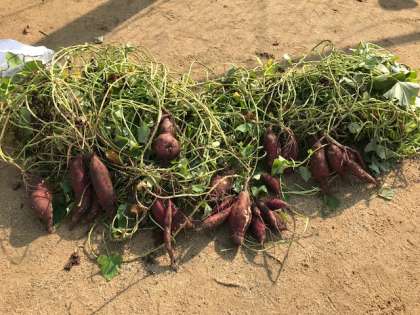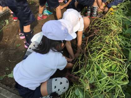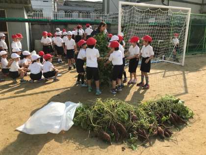 1年生が育てていたさつまいもが 大きく実りました。土の中から ゆたくさん出てきました。