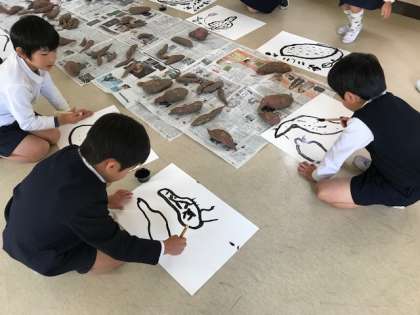 収穫したさつまいもの絵を 墨で描きました。