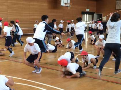 低学年は、大縄遊び(「ビッグウエーブ」)から8の字跳びへ